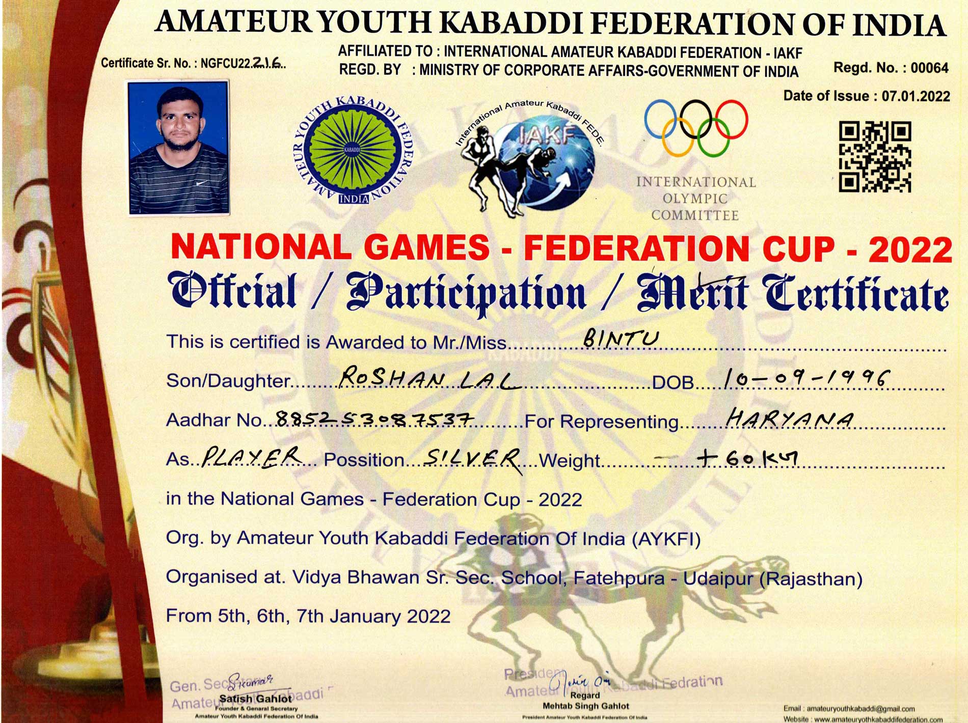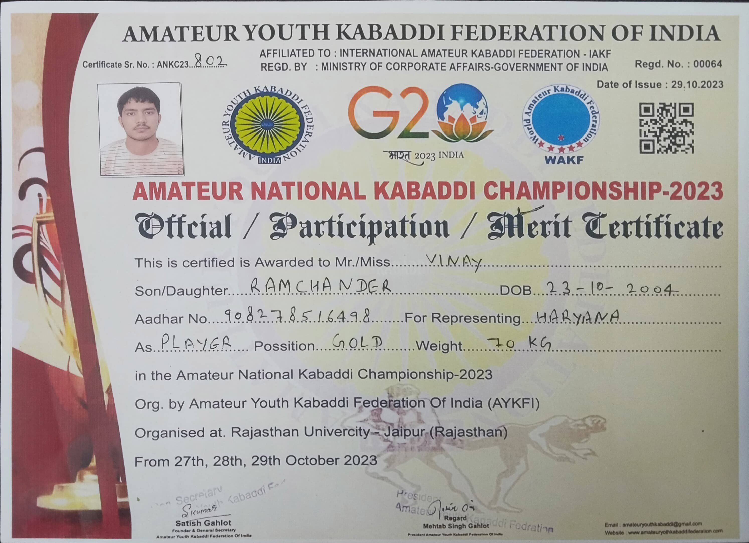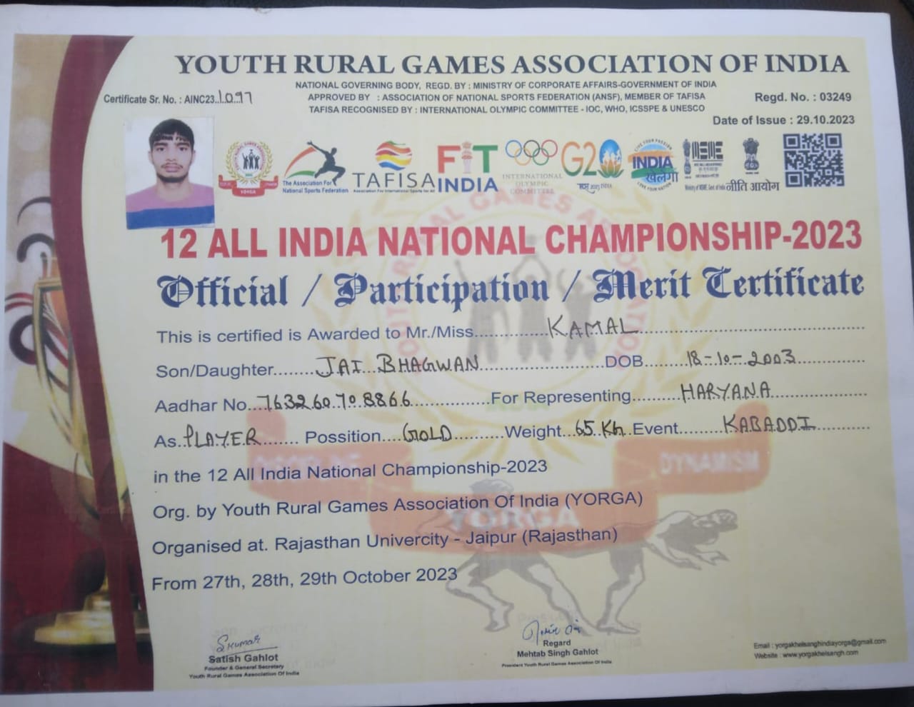 19-06-2024 >>Amateur Youth Kabaddi Federation Of India, 2023 Mr. Kamal S/O Jai Bhagwan