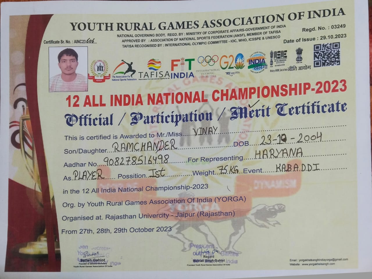 8-07-2024 >>Amateur Youth Kabaddi Federation Of India, 2023 Mr. Vishal S/O Mr. Satish