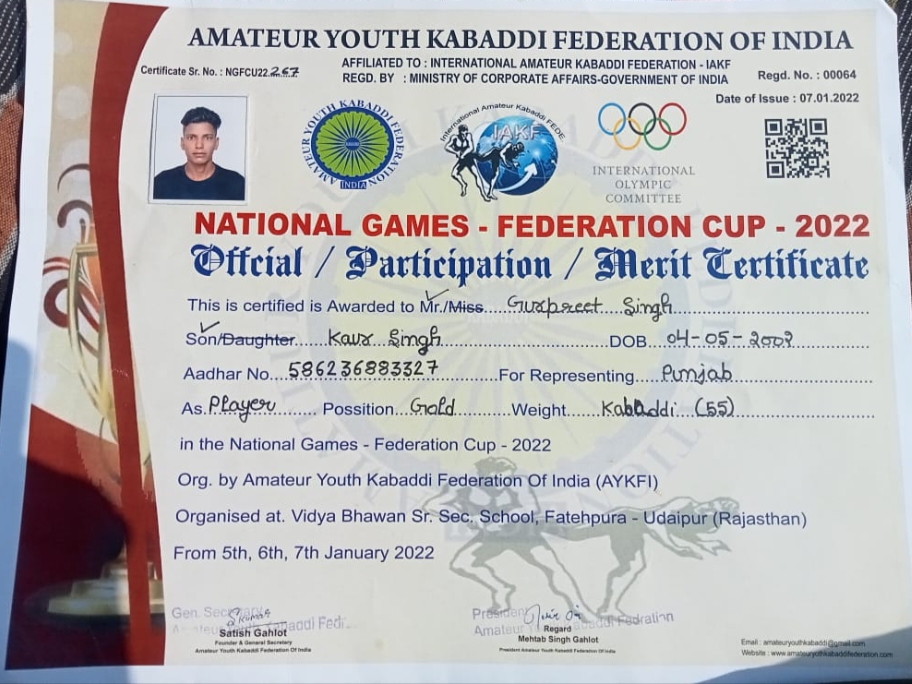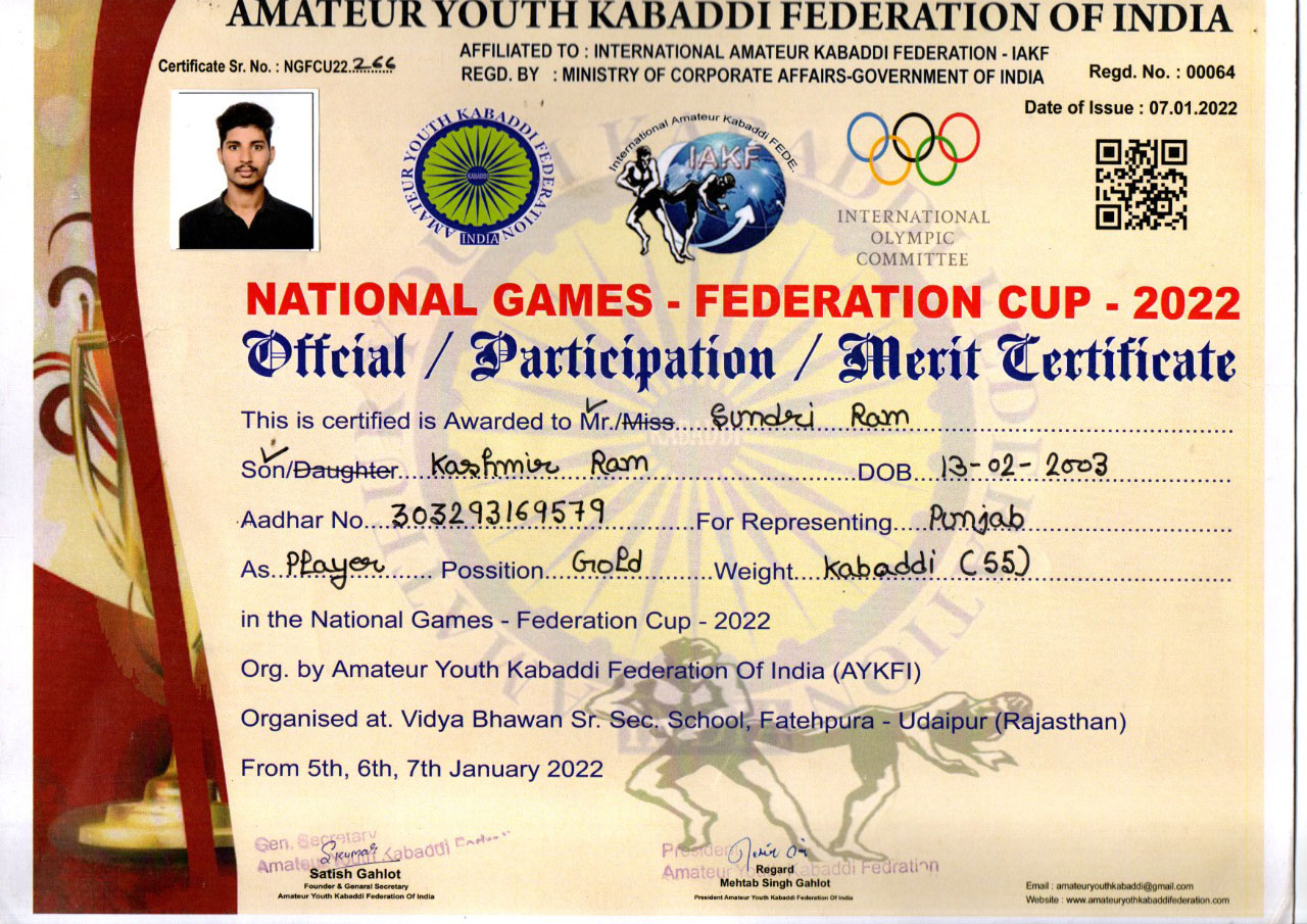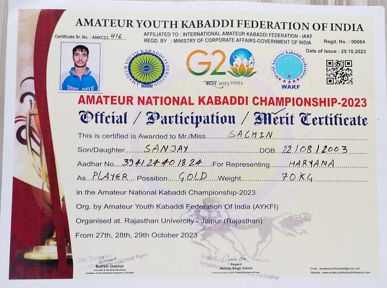 8-07-2024 >>Amateur Youth Kabaddi Federation Of India, 2023 Mr. Sunny S/O Ajit