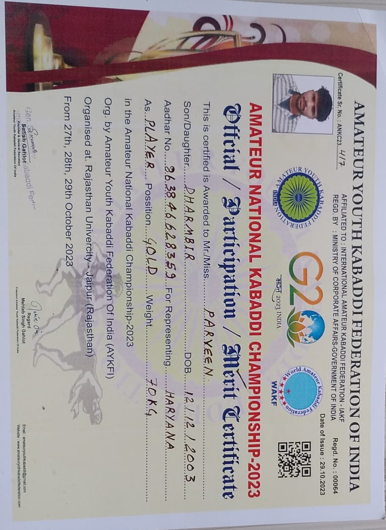 25-04-2024 >>Amateur Youth Kabaddi Federation Of India, 2023 Mr Parveen S/O Dharmbir