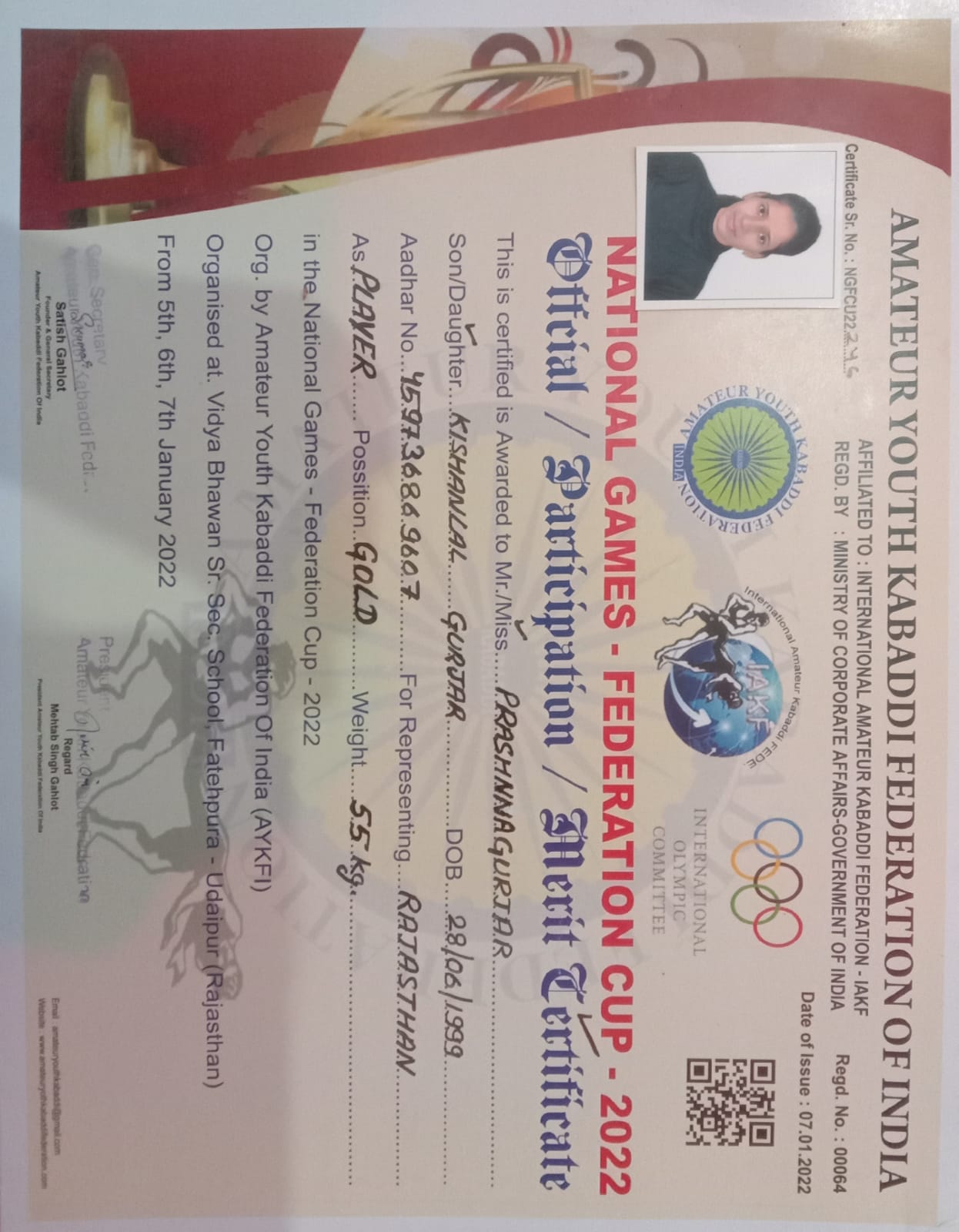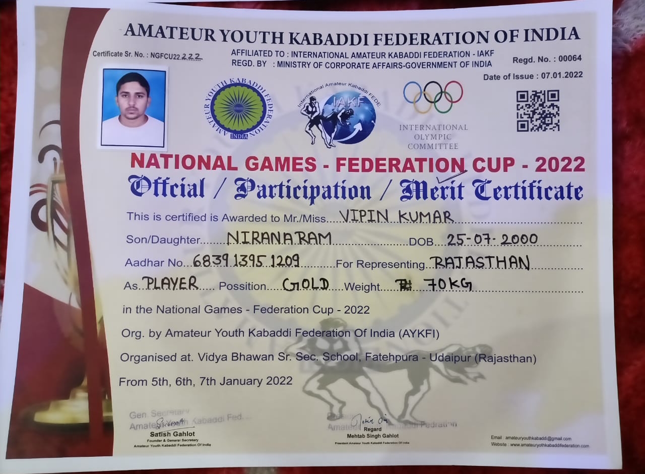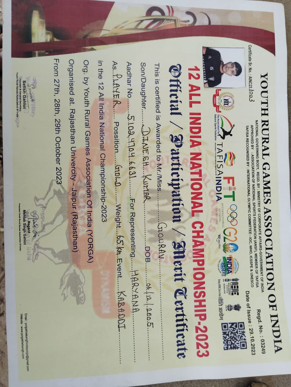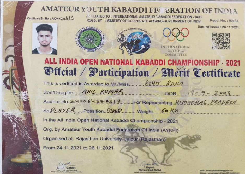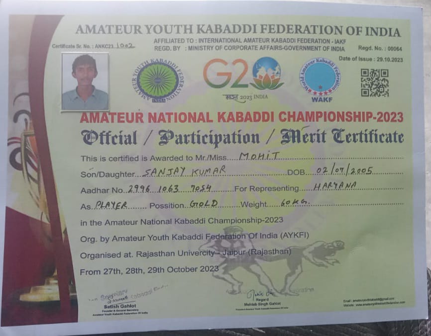 8-07-2024 >>Amateur Youth Kabaddi Federation Of India, 2023 Mr. Mohit S/O Mr. Ramesh