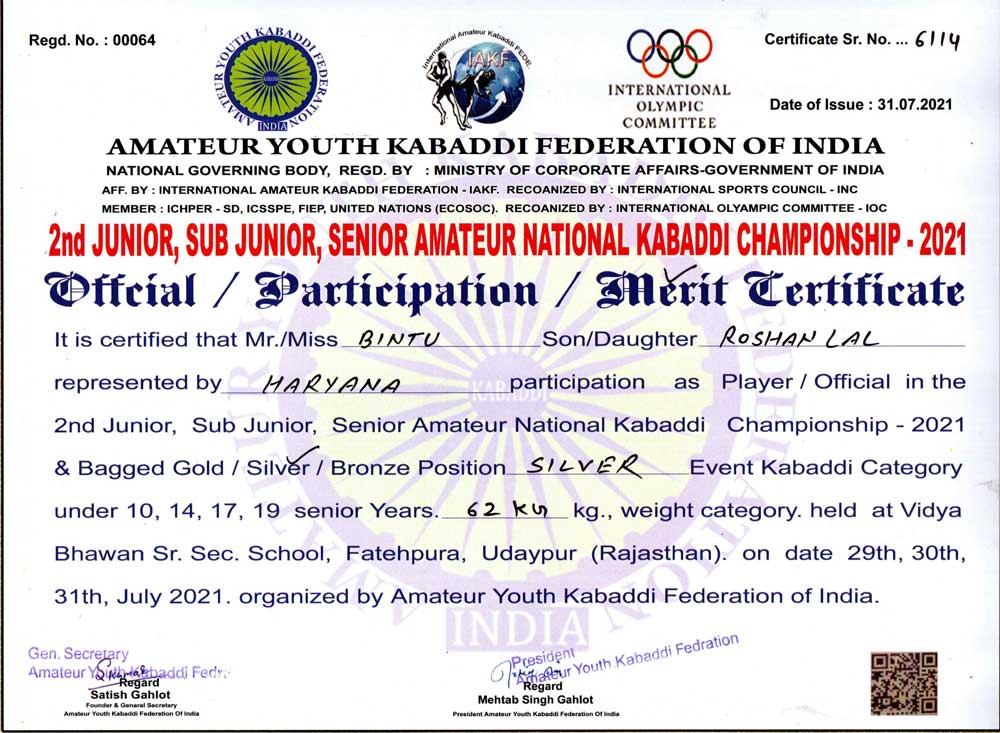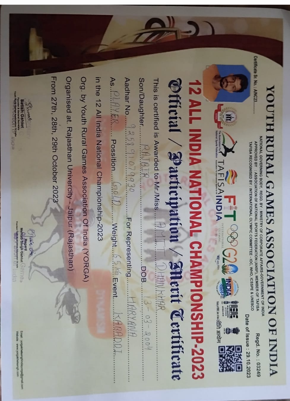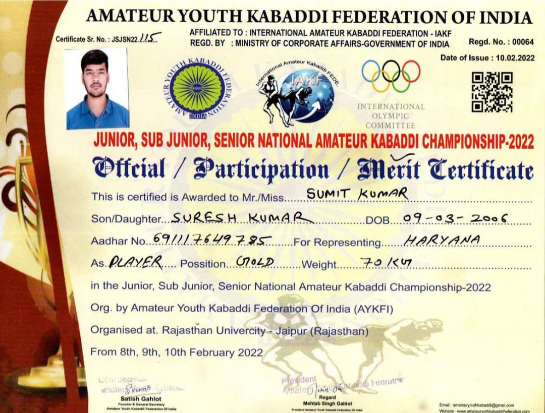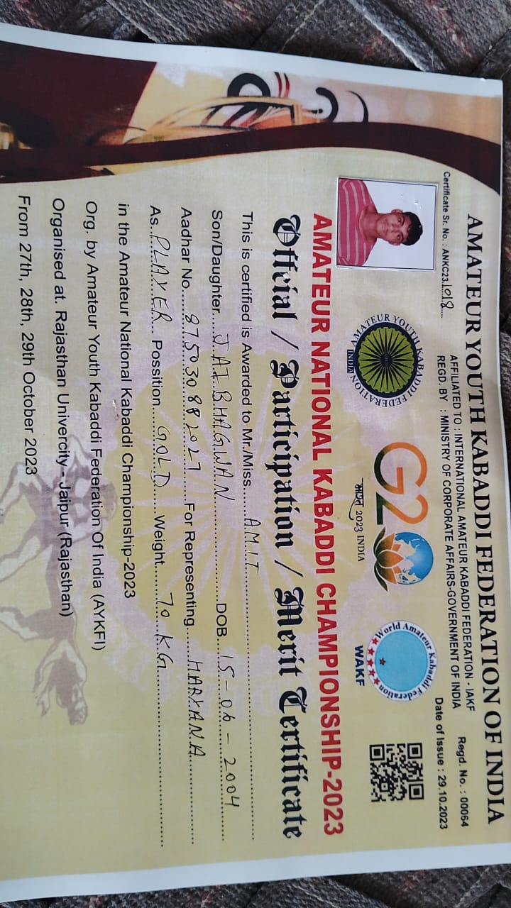 4-07-2024 >>Amateur Youth Kabaddi Federation Of India, 2023 Mr. Amit S/O Jai Bhagwan