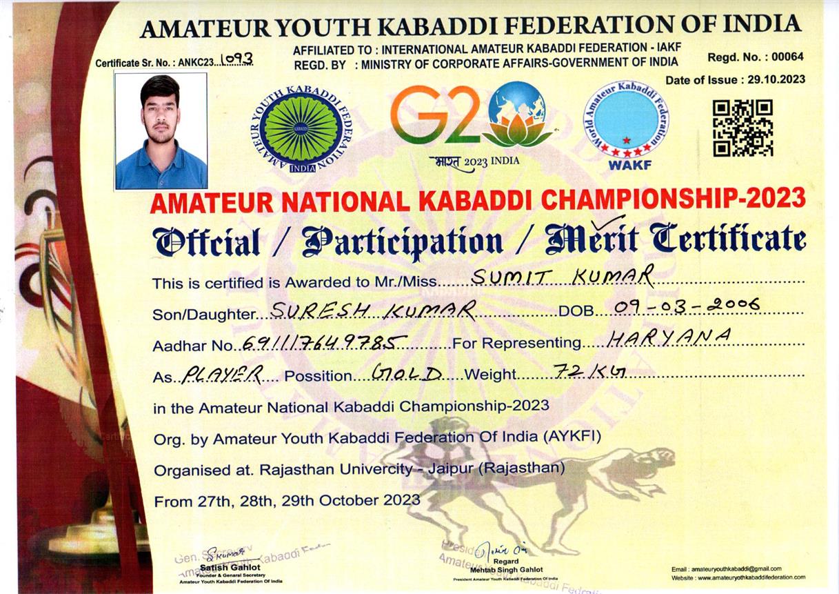 19-06-2024 >>Amateur Youth Kabaddi Federation Of India, 2023 Mr Sumit Kumar S/O Suresh Kumar