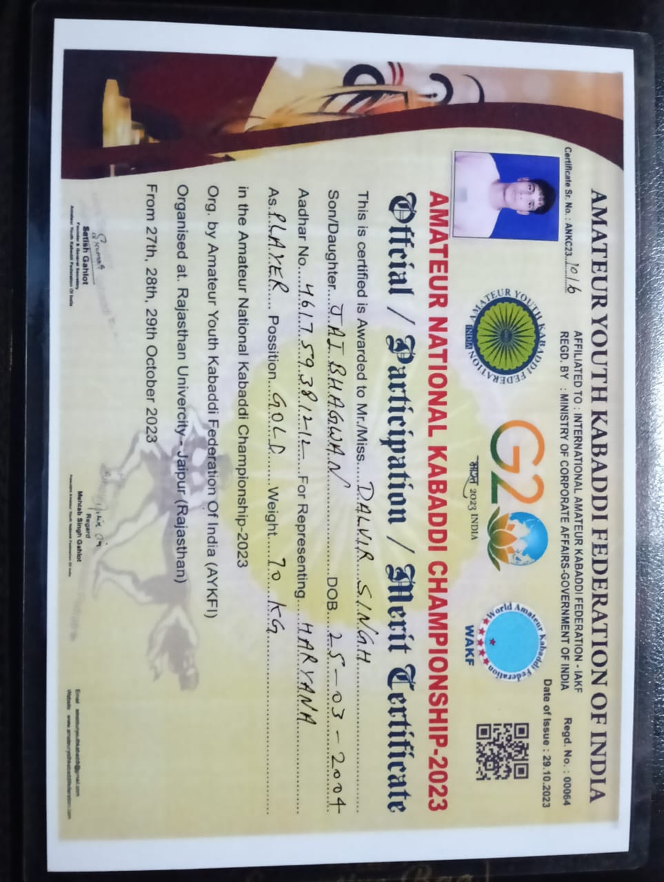 4-07-2024 >>Amateur Youth Kabaddi Federation Of India, 2023 Mr. Dalvir Singh S/O Jai Bhagwan
