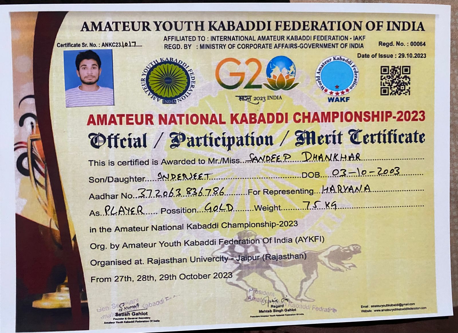 4-07-2024 >>Amateur Youth Kabaddi Federation Of India, 2023 Mr. Sandeep Dhankhar S/O Inderjeet