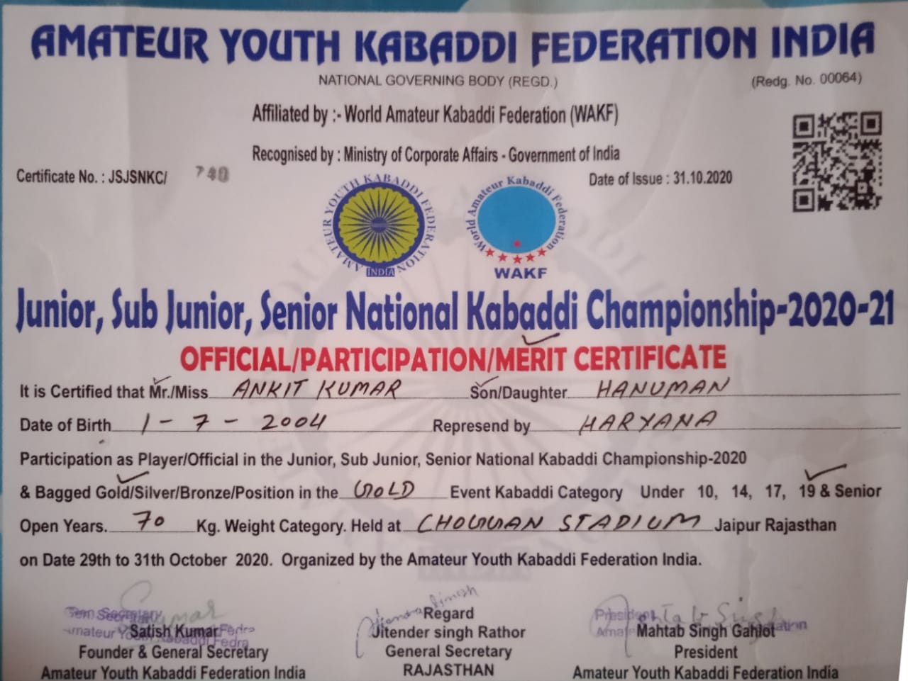 10-07-2024 >>Amateur Youth Kabaddi Federation Of India, 2023 Mr. Ankit S/O Mr. Rohtas
