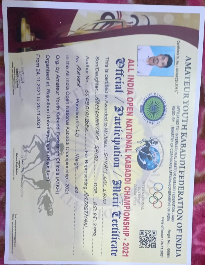 27-02-2022 >>All India Open National Kabaddi Championship Merit Certificate Ramchandra Saini